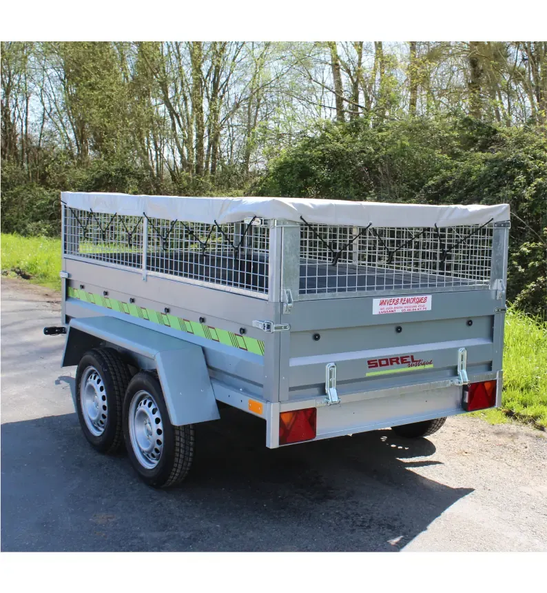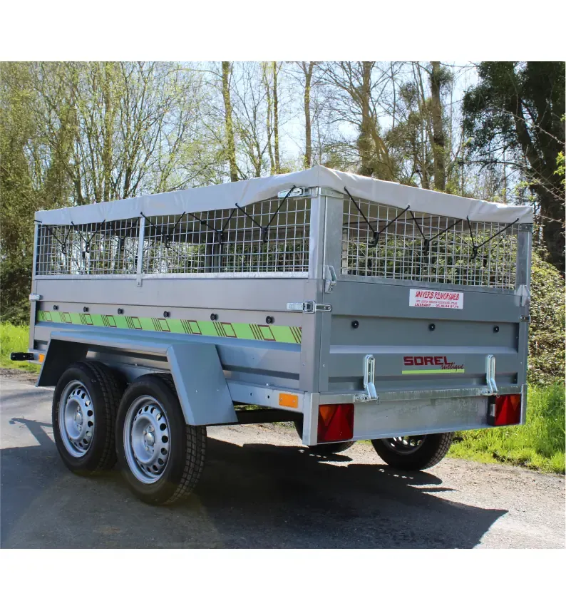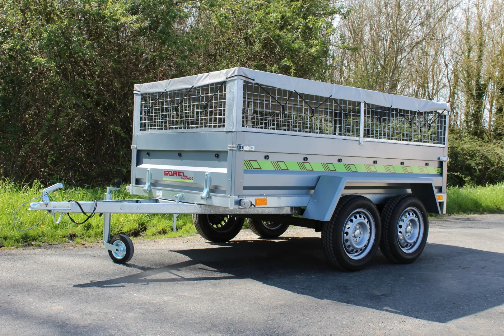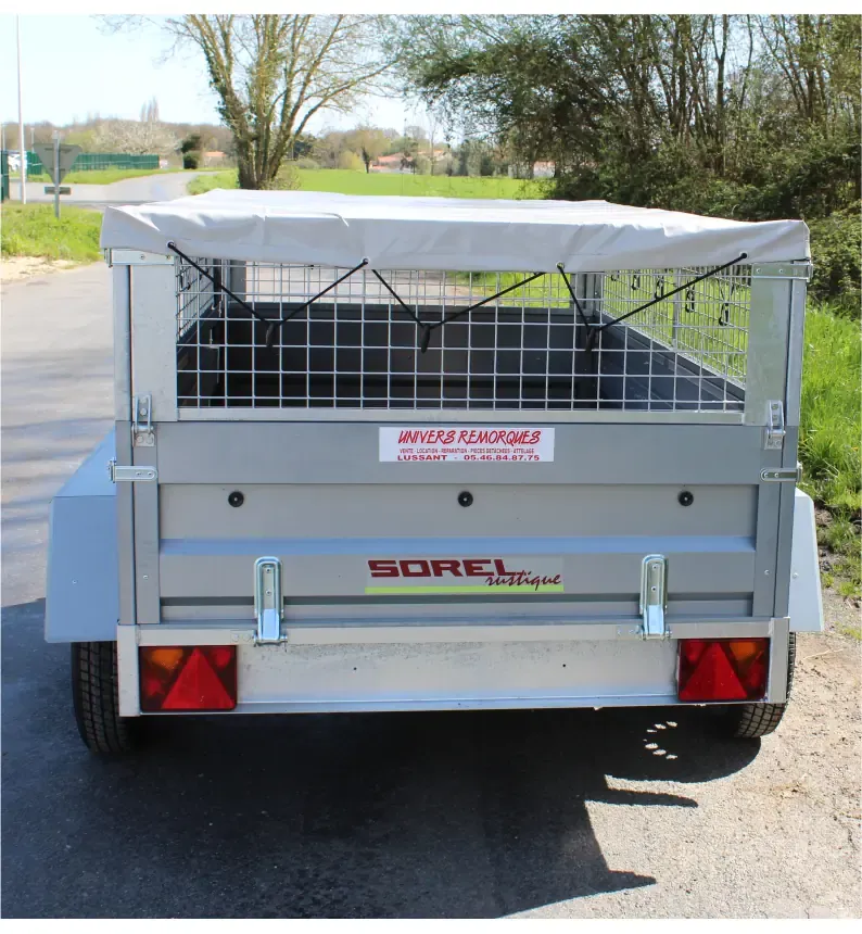 Remolque bagagero Rustique R256 de Sorel, caja útil 236 × 129 × 40 cm, PTAC 500–750 kg, peso vacío 210 kg, doble eje 750 kg, ruedas 155/70 x 13, chasis mecanosoldado y galvanizado, basculante, plancher antideslizante, 4 anillos de amarre y rueda jockey Ø 48.