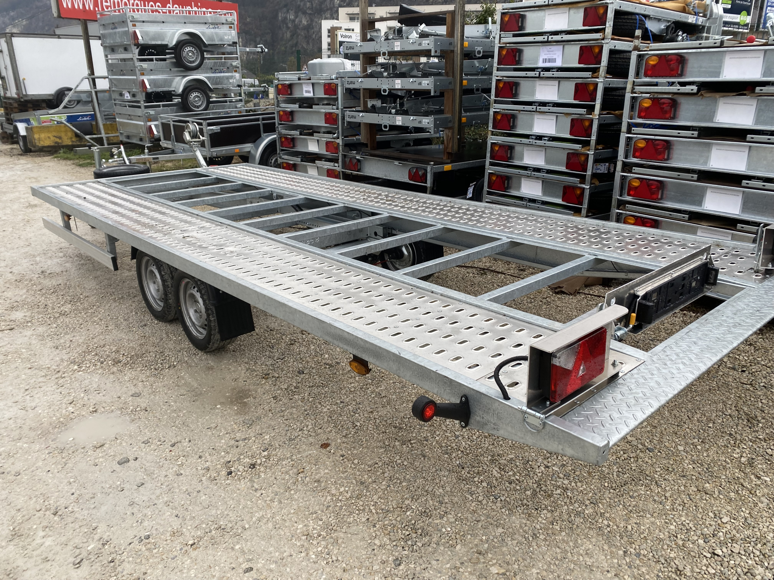 Su plateau basculante por inercia, asistido por 2 pistones de gas, permite un ángulo de carga reducido de 11° aprox.. El chasis mecano-soldado y galvanizado en caliente y los 2 caminos de rodadura de aluminio perforado tipo LOHR aseguran durabilidad y robustez.