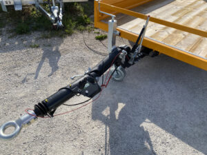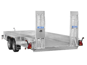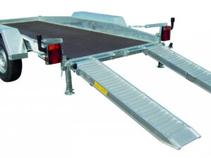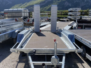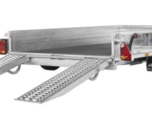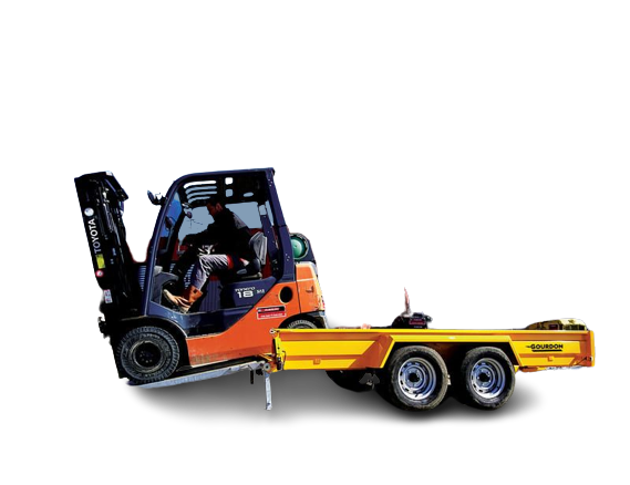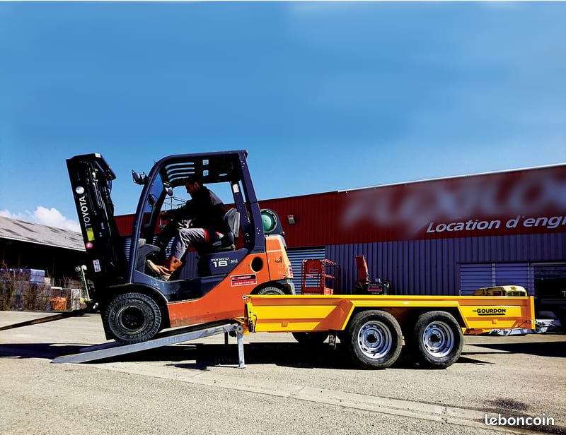 Remolque porta-maquinaria GOURDON CP35: PTAC 3500 kg, peso en vacío 700 kg y carga útil 2800 kg. Equipado con dos ejes de 1800 kg con freno por inercia y suspensión de torsión de caucho, cuatro ruedas exteriores 195R14C con guardabarros de acero monobloque. Timón regulable en altura con anillo de 68×42 mm. Dimensiones útiles: 3400 x 1650 x 260 mm. Plataforma fija con dos rampas de carga acero/madera elevables, barandilla tubular de 260 mm en la parte frontal y lateral, suelo de chapa antideslizante a 520 mm de altura, chasis de largueros mecano-soldado. Incluye cuatro anillas CE, dos patas traseras automáticas para bajada de rampas, pata de tipo agrícola y sistema eléctrico 7/13, 12 V. Certificado COC Europeo.