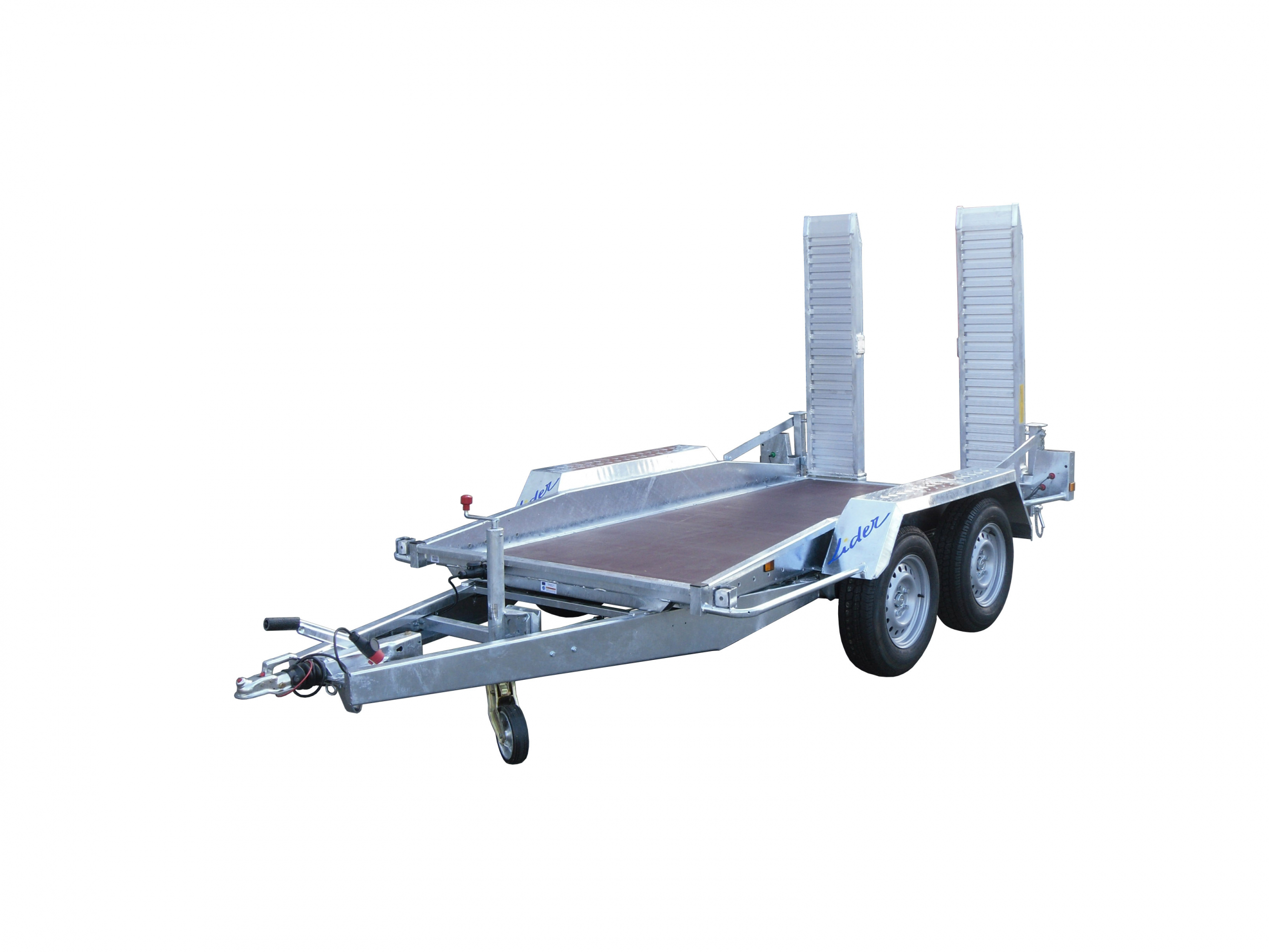 Remolque porta-maquinaria LIDER 40860 con timón fijo. PTAC de 3500 kg, peso en vacío 610 kg y carga útil de 2890 kg. Dimensiones útiles: 300 x 145 cm, con dos ejes de 1800 kg y ruedas 195R14C. Timón en V, rueda jockey automática de 60 mm, suelo de madera antideslizante de 18 mm y rampas de aluminio de 160 x 35 cm ajustables en ancho. Incluye patas estabilizadoras, chasis soldado en acero galvanizado en caliente, ganchos de amarre y toma de 13 polos.
